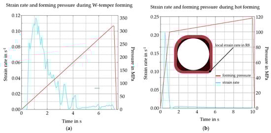 The investigated strain rates of 0.01 s−1 to approximately 1 s−1 represent the local strain rates occurring during the process very well, as can also be seen in Figure 7. Corresponding to the investigated pressure build-up rates of 5, 25, 45 and 99 MPa/s, respectively, strain rates up to approximately 0.12 s−1 during W-temper forming and 0.2 s−1 during hot forming occur locally in the component area with the largest deformation (radius R8). In reference to the mentioned results of the geometrical analysis of the parts, an influence on the formability or the achieved geometric accuracies was not determined so that the strain rate dependence has no significant influence on the process, at least in the considered strain rate range. Depending on the component geometry, however, significantly higher strain rates can occur in hydroforming processes, so the strain rate dependency must be taken into account and the determination of the material characteristics must be carried out at corresponding strain rates.