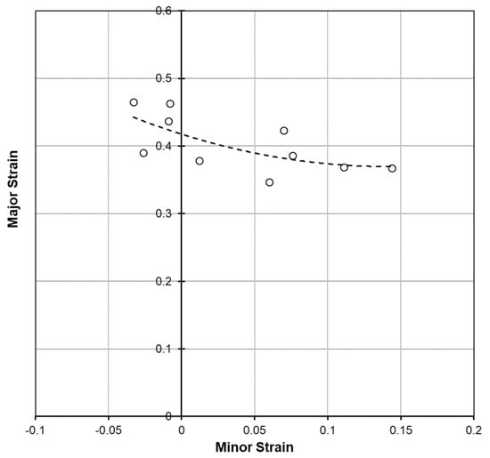 The FLC (Figure 2) is an indicator of damage occurring during the forming process. The abscissa axis (X) represents the minor strain, while the major strain is plotted on the ordinate (Y). The limit values were determined in order to mark the maximum deformation. In comparison to the classic literature, a narrower range of the minor strain was examined. This is possible due to the dominant stretching. The deep-drawing area has, therefore, not been studied as much. The shape suggests that a broader range of investigation leads to the classic form of FLC.