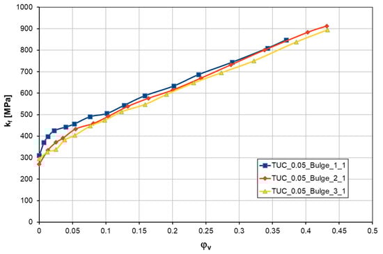 At low temperatures (20 °C), the forming rate of up to 40 1/s is of minor importance in steel [6]. Therefore, the tests were carried out quasi-statically. The equivalent strain-rate is in the range of approx. 30 to 50 1/s. The stress and strain values were recorded and recalculated as a flow curve using a tabular conversion. The effective plastic strain (φv) is shown on the abscissa axis and the yield stress (kf) on the ordinate axis—Figure 3. All three curves are almost identical, so it shows a high level of reproducibility. The tensile strength has a maximum value of 595 Mpa and the yield strength of 280 MPa.