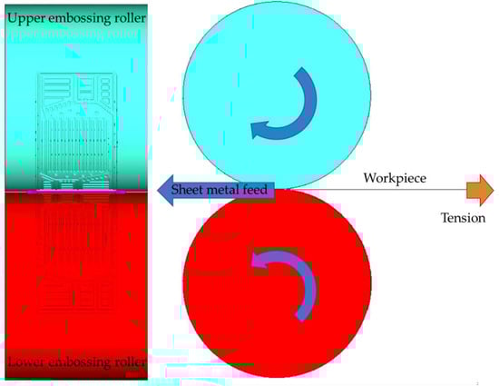 The movement of the embossing rollers is shown on the embossing image—Figure 4. The forming process is run with the target parameter in terms of the forming speed. The embossing rollers rotate at 60 revolutions per minute. Due to the roll diameter (approximately 105 mm), the strip feed is 0.33 m/s.