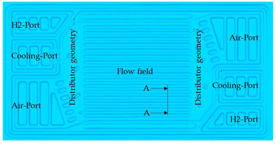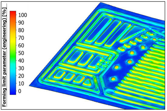 In the contour areas with relatively high material thinning, the forming limit is up to 60% utilized. Since narrow areas with high gradients are also difficult to interpret in this evaluation due to the mesh properties, a tendency to crack formation at the high geometric elements can also be determined in the case of the forming limit—Figure 8. In the area of the media ports, which are removed anyway after the forming process, this is irrelevant. Because of the low target geometry, the flow field can also be regarded as non-critical in this regard. However, the distributor geometry, which is located between the flow field and the media distribution, must be free of cracks after the forming. After the simulation, the target geometry can be produced using embossing rollers. In order to be able to reshape the areas of high thinning even better, a further adjustment of the flow distributor would be advisable. However, a final assessment of this technology requires experimental validation.