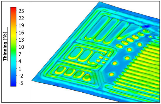 The thinning of the metal foil of the whole bipolar plate is up to 22% (Figure 7) in the areas of high contour formation. These areas are not in the flow field but in the distributor geometry. For a foil with a thickness of 50 µm, this means a remaining material thickness of approx. 39 µm. This value is just within the target range so as not to overstrain the foil. Even greater thinning in narrow areas would indicate a sensitivity to cracking due to a large-meshed model compared to the very fine geometric elements. The predicted thinning in the river field was not quite achieved at around 10 to 15%.