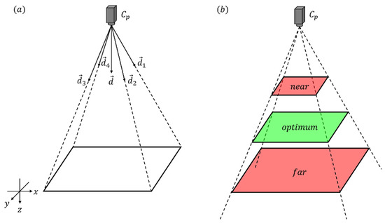 The field of view determines which points are captured by the camera and which are not. Therefore, the camera field of view is modeled as a bivalent function and can be calculated using the four direction vectors and (Figure 2a). The four direction vectors are computed using the intrinsic camera parameters and the direction vector . Pairwise, the direction vectors span four planes. All points located within the four planes are captured by the camera. A detailed calculation is shown in [13].