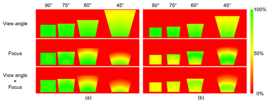 Visualization of the field of view on a flat surface under the impact of view angle (first row), focus (second row) and combination of both (third row) for four different camera tilt angles: (a) distance between camera and surface is 200 mm and (b) distance between camera and surface is 160 mm.