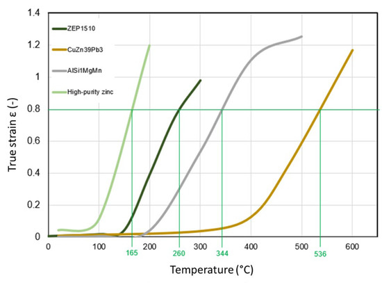 Formability of high-purity zinc, ZEP1510, AlSi1MgMn, and CuZn39Pb3 as a function of temperature.