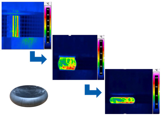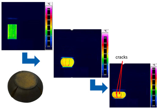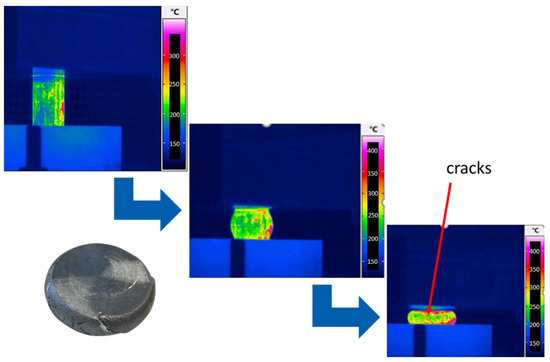 In the case of AlSi1MgMn, the upsetting temperature was lowered step by step from 500 °C onwards. During the upsetting tests with an initial temperature of 200 °C, cracks appeared that can be clearly seen with the IR camera (see Figure 6).