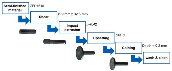 Bars with a diameter of 9 mm were used as semi-finished products, which were sheared to a length of 32.5 mm. After passing through the forming stages, the components were cleaned. The lubricant application is usually divided into two steps, namely surface pre-treatment and the application of lubricant. Surface pre-treatment is not necessary for ZEP1510 due to the alloy. For cold forming of ZEP1510, forming oils are recommended. The lubricant used in the tested cold forming processes was the metalworking oil Beruform MF 155 from Carl Bechem GmbH.