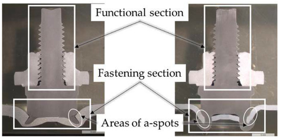 In addition to the bolting of thin semi-finished products, functional elements also enable one-sided accessibility [8] during assembly. For this reason, and due to the low energy requirements in the manufacture of the joints, these joining processes are extremely cost-effective. Previous work on functional elements has dealt with basic characteristic value determinations about mechanical applications [9]. Furthermore, Wanner [10] carried out investigations of these elements with a focus on the stress limits for functional element bolted joints. In [11], Denkert dealt with the design and assembly of threaded supports inserted into sheet metal by forming technology. The range of applications for mechanically set functional elements is wide, such as for purely mechanical applications, e.g., for fastening clinched bus bars (Figure 1), or for electrical applications, e.g., for grounding without carrying significant continuous currents, for which self-piercing bolts are used. Furthermore, functional elements can also be used for coated and thermally sensitive materials or surfaces. Functional elements have, on the one hand, a fastening section with which the elements and the base component are joined and, on the other hand, a functional section which, depending on the intended use, can be designed, for example, as a threaded carrier (Figure 2).