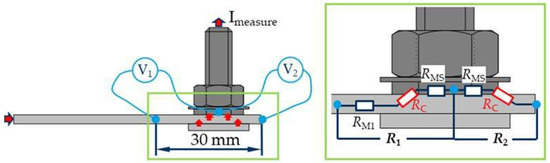 The self-piercing studs used here were integrated directly into the current path. The current must flow through the functional element after contact. In this application, the functional element closes the circuit for the operation of an electrical consumer, e.g., via the vehicle body (grounding). Two potential measuring points (R1 and R2) were defined on the sheet metal for the self-piercing studs (Figure 4). With the potential measuring point at the “currentless” end for R2 of the bus bar, the proportion of material resistance (RM) can be minimized and thus the contact resistance (RC) can be determined accurately.