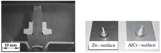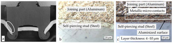 Metallographic cross-section of the fastening section (a), of surface layers at self-piercing studs with zinc coating (b) and Al-Cr coating at the self-piercing stud (c) [20].