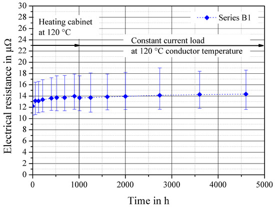 Electrical resistance (R2) depends on the time in a heating cabinet at 120 °C (continuous load) and constant current load at 120 °C conductor temperature in accordance with [20].
