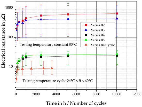 The long-term behavior of Series B1 under a thermal load of 120 °C for 1000 h (formation phase) in the heating cabinet shows only very slight resistance changes for joints with self-piercing studs with a galvanized surface and sheets made of DC04+ZE75/0 (Figure 8). Under a thermal load caused by an electric current (140 A) which a temperature in the homogeneous conductor also of 120 °C establishes, the samples were applied for a further 4000 h. The measured values shown were determined at measuring position R2, so the influence of the material resistance is minimized. Long-term stable operation, e.g., for grounding, is possible for an operating temperature of 120 °C.