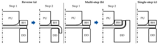Tools for the process variants: (a) reverse deep drawing; (b) multi-step deep drawing; (c) single-step deep drawing; PU—punch; BH—blank holder; DD—drawing die.