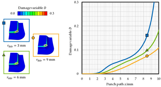 The results for the variation of process parameters in form of different drawing die radii are depicted in Figure 2. When the deep drawing process began, the damage variable in all elements was zero until initial contact of the die, punch, and sheet was established. Such is the result of the sheet holder first pressing the sheet onto the drawing die to ensure stable contact followed by movement of the punch towards the sheet without contact. Damage development started in the considered area after the punch path reached approx. = 2 mm, once plastic deformation due to the bending at the drawing ring radius and around the punch began. The three damage variable curves all started to increase from a punch path of = 2 mm. All progressions showed an approximately linear increase with an offset with ascending die radius. Starting from a punch path of = 7 mm, the curves diverged. The curve of drawing die radius = 3 mm showed a considerably stronger increase than the other two curves. At the selected reference position of = 9 mm, the damage variables reached = 0.16, = 0.098, and = 0.074.
