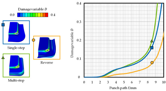 While the damage variables of single-step and multi-step deep drawing displayed a comparable progression, the progression of the damage variable of reverse deep drawing showed a minor increase. After reaching a punch path of s = 8 mm the curves of single-step and multi-step deep drawing diverged. The damage variables then achieved = 0.19, = 0.16, and = 0.088 at the selected reference position of s = 9 mm.