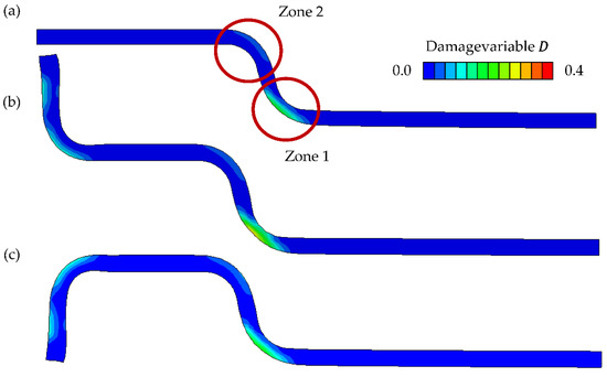 Distribution of damage variable D: (a) drawing ring radius = 3 mm; (b) drawing ring radius = 6 mm; (c) drawing ring radius = 9 mm.