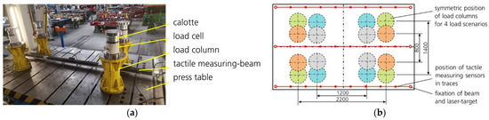 For the measurement of the deflection behavior of the press table and ram clamping surface, it is necessary to load the assemblies with a defined force. In a hydraulic press, the force is generated directly from the main drive of the machine. The force is applied to the table and slide assembly by means of load columns arranged in the working area and is equipped with appropriate measuring sensors, specifically load cells (cf. Figure 1a). An individual load case is thereby defined by the number, the positions of the load columns, and the applied force in each case, as shown in Figure 1b. These load cases are used both for defined recording of the deflection at the clamping surfaces as well as an input variable for model generation afterwards [5].