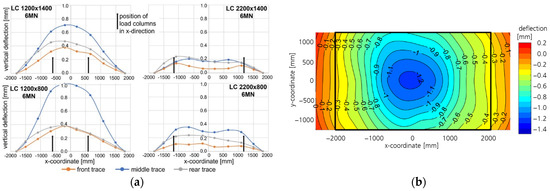 For the interaction with the forming tool, a two-dimensional distributed contact is necessary; therefore, a correct interpolation of the deflected clamping surface of the press table and ram is essential. Figure 2b shows the interpolated (and partially extrapolated in the x-direction) surface of the press table for the load case (LC) with column position at 1200 × 800 mm and a summed load of 6 MN.