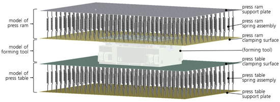 The plate facing the forming tool fulfills the function of the contacting clamping surface of the ram or press table, while the plate facing away from the tool acts as a support plate and improves the reproduction of the bending stiffness of the press component. The spring assembly consists of regularly arranged unidimensional spring elements that couple the two plates in the form of individual compression stiffnesses.