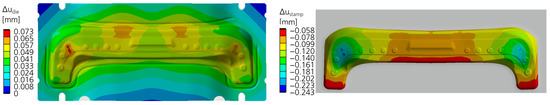 In Figure 6, the reaction of the tool’s active surface (drawing die and drawing stamp) is shown in the form of a vertical deflection under an applied acting force of 6 MN, which is the typical forming force for this tool. The load distribution applied to the surfaces is the result of a forming simulation that was previously performed and the clamping surfaces of the upper and lower tool are fixed, which would represent an ideally rigid press.