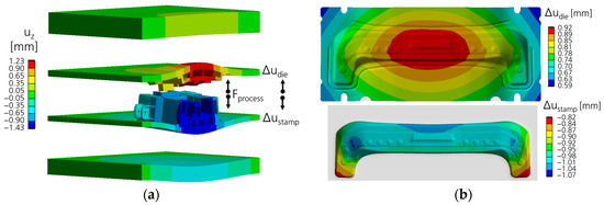 Increasing the model complexity by adding the reduced models for the press table and ram leads to more realistic boundary conditions of the tool clamping surfaces. Figure 7a shows the deformed model of the press ram and table together with the mounted tool, whereby the active surfaces of the die and stamp are loaded and the ram and table are fixed. The gap between the active surfaces (sum of Δudie and Δustamp) indicates the necessary portion of the cambering. The deflection of the single active surfaces is shown in Figure 7b and results in a variation in the vertical deflection in the contacting area of Δudie = 0.330 mm for the drawing die and of Δustamp = 0.254 mm for the drawing stamp.