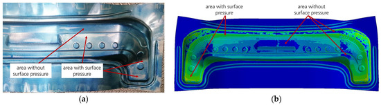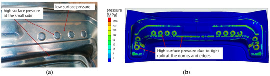 By mechanical reworking during the tool tryout of the geometry of the dies’ effective surfaces, which are in contact with the blank, the actual spotting pattern (with failures) converges on the ideal spotting pattern. To check the real spotting pattern, the pre-drawn sheet metal part was covered with spotting paint from both sides before the forming process (calibrating part) was performed. After opening the die, the local die closure can be identified by the color distribution on the sheet metal component (upper and lower side) as well as on the effective die surface. The same process can be virtually performed using an FE model. By introducing the press force into an FE model modified for this purpose, the corresponding surface pressure can be determined at the die’s active surfaces, which are in contact with the sheet metal part, as shown in Figure 8a.