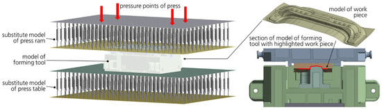 (a) Displacement of forming tool and reduced model of press table and ram (4-point hydraulic press) due to applied forming process pressure distribution on both sides of the active surfaces in contact with the metal sheet; (b) detailed displacement of active surfaces of die and stamp including press elasticity.