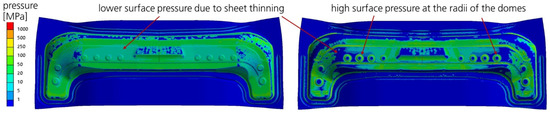 Even though the elasticity of the sheet is of subordinated relevance in the calibration process, the thinning due to the preceding drawing process has a large influence on the pressure distribution. Figure 10 (right) shows the spotting pattern resulting from the same simulation, including the varying sheet thickness of the previously drawn workpiece, which results in areas with lower pressure and, consequently, local pressure hotspots, especially in the areas of smaller radii (domes).