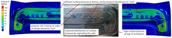 Parallel to the virtual analysis, the real tryout process was carried out with the described test tool on the test machine. The first spotting loops in Figure 11a showed qualitatively similar pressure patterns, with the dominance of the pressure distribution along the narrow radii, as seen in the simulation by the raw CAD geometry in Figure 11b.
