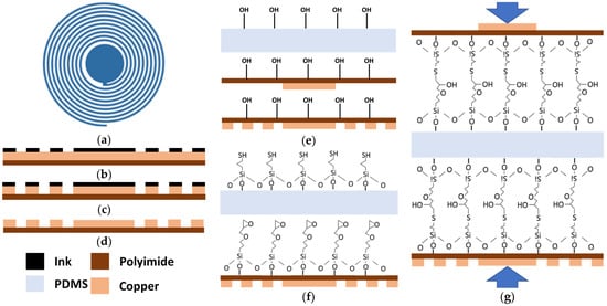 Sensor designing and fabrication process: (a) Pressure sensor geometry, (b) Ink mask printed on copper-coated polyimide sheet, (c) Sensor patterns after etching process, (d) Sensor pattern after cleaning with acetone, (e) Plasma treatment of PDMS and polyimide, (f) Chemical surface functionalization, (g) PDMS sandwiched between polyimide sheets to make the final assembly of the sensor under pressure.
