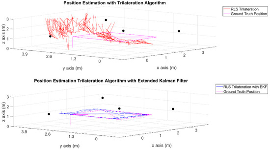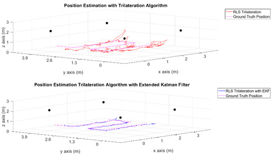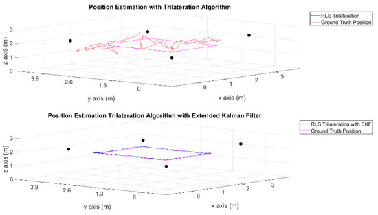 The MATLAB environment was used while creating the simulation system. The data were produced synthetically in MATLAB, and the algorithm was tested under the generated data. In addition, three different trajectories were used while generating synthetic data. These trajectories are shown in Table 1. In Figure 3, Figure 4 and Figure 5, both the position calculations were calculated with the trilateration algorithm alone, and the position calculations obtained as a result of using the IMU data together with the trilateration and EKF algorithms are shown. The minimum, maximum and average error amounts of the calculated positions are shown in detail in Table 2. The RMS value was used while generating error amounts. According to the simplicity and complexity of the determined trajectories, the error amounts obtained by using only the trilateration algorithm differ. For example, the error amounts of position estimation and position estimation obtained by using only the trilateration algorithm between Trajectory 1 and Trajectory 3 differ considerably. However, with the inclusion of EKF in the calculation of position estimation, it is easily observed that the amount of error obtained decreases both in the relevant Figure 3, Figure 4 and Figure 5 and in the values given in Table 2.