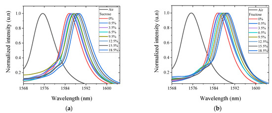 The response of the fabricated sensor was tested with sucrose and fructose. Experimental tests were initiated by fixing the sensor in a container and covering it completely with each liquid sample (aqueous solutions of sucrose or fructose, with concentrations ranging from 0.5% to 18.5%, in increments of 1.5%). For each sample, the spectrum of the obtained signal was recorded in the OSA. Subsequently, the sensor was meticulously cleaned using de-ionized water; when dried, the sensor was reattached, so that it was placed in initial conditions. Figure 2a shows the spectral change in the sensor in response to the sucrose concentration, while Figure 2b shows the displacement in response to the fructose concentration.
