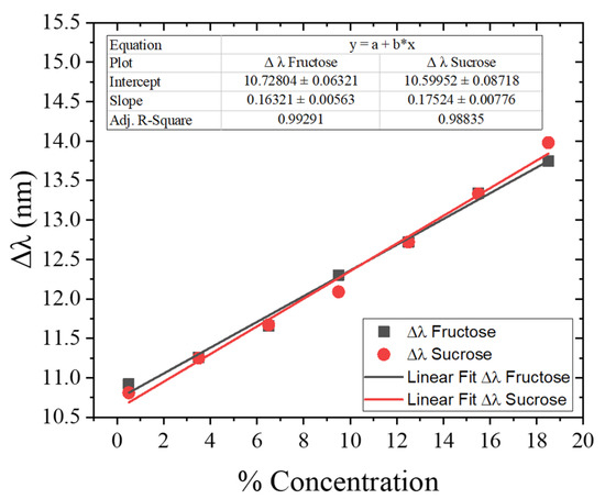 The spectral shift of the peak of the wavelength, , for each sugar is shown in Figure 3, as a function of sugar concentration in the solution. This displacement is calculated as the difference between the maximum peak wavelength when the SMS structure is immersed in the mixture and its measured position in the air. The positive spectral change is proportional to the concentration level of the sample. By increasing the amount of sucrose and fructose, respectively, the displacement of the peak of the wavelength increases.