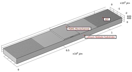 The SAW-based system is composed of a 500 µm thick piezoelectric substrate, on which a polydimethylsiloxane (PDMS) straight microchannel is placed. Two IDTs are patterned on the surface of the substrate, near the sides of the microchannel. This positioning leads to the generation of two counter-propagating surface waves, which constructively interfere in the PDMS channel to generate an SSAW. The IDTs are made of 15 couples of 70 µm wide gold finger electrodes. As the SAW wavelength is equal to the pitch of the IDT (width of two electrodes + width of two spaces between the electrodes), its value is thus 280 µm (70·2 + 70·2). Therefore, the wavelength of the surface waves can be selected by designing the IDTs. To investigate the sensitivity of the pressure field distribution within the fluid domain contained in the microchannel, a parametric study on the dimensions of the microchannel was carried out. The particles dispersed in the fluid were assumed to be composed of polystyrene and have a spherical shape, with a diameter of 2, 4, 6, 8, and 10 µm. All the dimensions of the device are reported in Table 1 and in Figure 1.