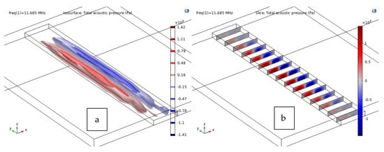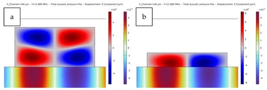 A parametric sweep on the dimensions of the microchannel was next performed, to study how they affect the pressure field within the fluid. The PDMS was modeled as a linear elastic solid, and some results are reported in Figure 3, in terms of the standing pressure field. It can be seen that the pressure distribution was regular and featured a central pressure node, sided by two antinodes (the red and blue regions of the plots). The wave transmission mechanism can be recognized in Figure 3b, where both the surface displacement and the pressure field are plotted, referring to a 50 µm thick channel. In Figure 3a, results refer to a thickness of 140 µm, to show that the pressure wavelength is around 140 µm, as set in the analyses. The following results refer to a 50 µm thick channel.