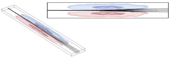 A 3D view of the acoustic pressure is reported in Figure 4. The shape of the pressure field was similar to two clouds corresponding to the antinode regions, with a pressure node at mid-width. This solution led to the simulation of the trajectories of the microparticles in the channel under the effects of the ARF and of the drag force. The plots of the trajectories in Figure 5 show that the particles were actually displaced towards the pressure nodes, allowing their focalization in the line/plane of the pressure node.