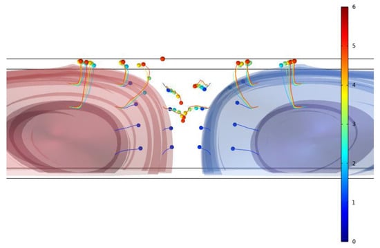 To highlight the possibility of sorting particles of different sizes due to the ARF, particles were released at the inlet for five increasing values of the diameter: 2, 4, 6, 8, and 10 µm. Figure 6 shows the trajectories of all the particles projected onto the cross-section of the microchannel. It is reported that the larger the diameter, the greater the ARF and, therefore, the more the particles are displaced: red particles (10 µm in diameter) then reach the center of the channel, while blue particles (2 µm in diameter) are only displaced a short distance. Hydrodynamic techniques can also be exploited together with the acoustic manipulation to improve particle sorting based on dimensions [19], but this solution has not been studied in this model.
