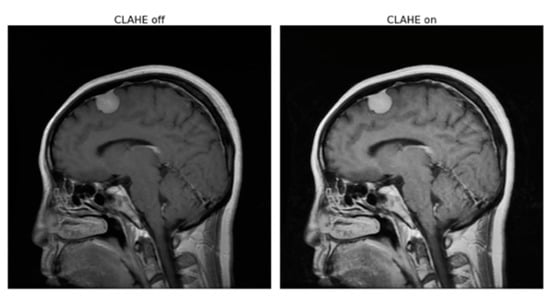 The Contrast Limited Adaptive Histogram Equalization (CLAHE) preprocess has been applied to RGB images by converting the color format from BGR (blue green red) to LAB and then applying CLAHE on the L channel with a custom clip limit and tile grid size. An example of the CLAHE process can be seen in Figure 2.