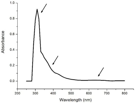 Absorption spectrum [Laccase T. Versicolor] = 8 μg/mL in 0.1 M acetate buffer at pH 5.0. Arrows indicate the presence of the peaks at 310 nm, 330 nm, and 650 nm, respectively.
