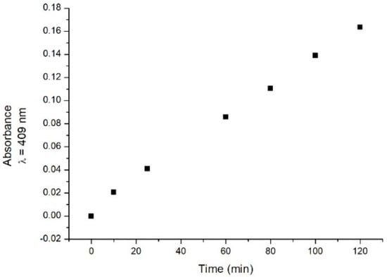The absorption spectrum of the laccase samples was then recorded in the presence of catechol at a fixed concentration (0.4 mM) at different times (t0 = 0 min, 10 min, 25 min, 1 h, 80 min, 100 min, and 2 h after catechol addition). Changes in the absorption spectrum are observed during the time. An increased absorbance is observed in the 300–500 nm range (data not shown). As representative behaviour, the absorbance values detected at 409 nm (where a signal possibly related to a reaction intermediate could be present) extracted from the recorded spectra are shown in Figure 2 as a function of incubation time. The data show that the absorbance increases with time in the considered time interval.