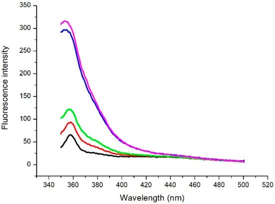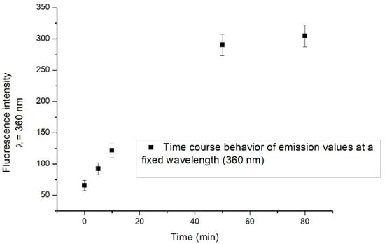 An increase in the fluorescence emission intensity is observed in the range of 330–420 nm, the most significant effect being detected after 50 min. As an example, we show in Figure 4 the time course behaviour of fluorescence emission intensity at a specific wavelength (360 nm). After 50 min, the fluorescence intensity reaches its saturation level.
