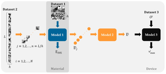 Overall model schematic, composed of three data-driven submodels to account for material- and geometry-related uncertainties at different (termed material and device) length scales.