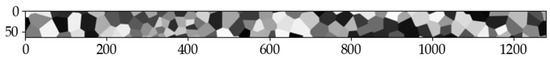 As introduced in Section 2.1, Model 2 was trained based on a dataset composed of N samples of size L × h, where N = 1050, L = 40 µm, and h = 2 µm, so that n = 20. At variance with former works [9,10,11,12], where each slender beam was considered as a concatenation of a single individual domain of size h × h, in the current work, a microstructure was digitally generated for the entire geometry of the beam following the same procedure specified in Section 2.3.1. Figure 3 illustrates one of the generated beam microstructures, displaying a resolution of 64 × 1280 pixels.