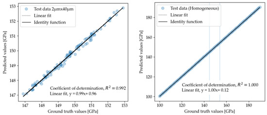 Each beam indexed by i (i = 1, 2, …, N) is partitioned into a set of j (j = 1, 2, …, n) 64 × 64 pixels subdomains that are fed to the already trained Model 1 to generate a vector of predictions that constitute the input of Model 2. Model 2 is trained to map the vector of predictions from Model 1 into the homogenized Young’s modulus of the entire beam structure. Additionally, following a format given by number of samples, mean, and standard deviation of the target values, Dataset 2 was composed by: Training set = 800, 149.5 GPa, 1.3 GPa, Validation set = 150, 149.6 GPa, 1.3 GPa, Test set = 100, 149.6 GPa, 1.4 GPa. An additional test set, namely, Test set 2 = 91, 145.0 GPa, 26.3 GPa, consisted of 91 additional data points simulating beams of a hypothetically homogeneous material (so that no real microstructures need to be generated), displaying values of Young’s modulus in the range [100 GPa, 190 GPa]. This set was used to assess the generalization capabilities of Model 2 outside the range of target values characterizing the polysilicon beam microstructures, given by [144.9 GPa, 154.0 GPa].