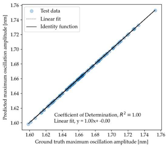 The best performing model was obtained for the combination given by {50, 150, 50, 0.01}. With these hyperparameters, Model 3 consists of a total of 15,401 fitting parameters. Figure 5 summarizes the performance of Model 3 on the test set, which can produce exact one-to-one predictions. In this case, the MSE values associated to each of the sets correspond to 2.099 × 10−8 nm2, 2.065 × 10−8 nm2, and 1.966 × 10−8 nm2 for the Training, Validation, and Test sets, respectively.