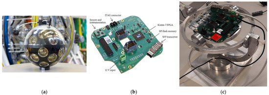 The KM3NeT DOM, CLB and CLB onshore calibration test: (a) DOM mounted; (b) CLB unmounted of the DOM; (c) CLB mounted in the “Wobbling” test bench.