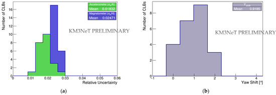 A relative uncertainty for accelerometer and magnetometer (σA/A and σH/H) readout < 10% is demanded as the acceptance criterion for the CLB integration. If the acceptance test is successful, a stringent cut in Yaw residuals (difference with respect to the four cardinal points) is required, one of ≤ 3 deg for CLB integration (Yaw shift ≤ 3 deg in average) and of ≤ 6 deg for DOM integration. After this, calibration constants are allowed to be uploaded to the KM3NeT database. Accelerometer- and magnetometer-derived relative uncertainties, computed for a small CLBs sample during a recent calibration at the UPV KM3NeT Lab, as well as the resulting Yaw shift, are shown in Figure 2.
