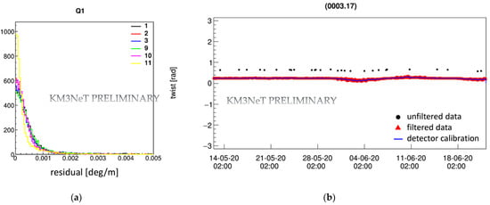 Dynamic orientation calibration for Digital Compasses in ORCA detector: (a) Q1 (twist) residuals (color refers to the DU); (b) Q1 as a function of time (DU3F17).
