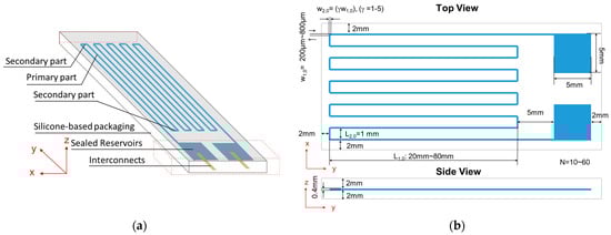 As shown in Figure 1a, the microchannel is a long winding channel that comprises two parts: a primary microchannel (PM) and secondary microchannel (SM). The PM represents the portion of the microchannel along the y-axis. Similarly, SM refers to the portion of the microchannel along the x-axis. Figure 1b elaborates on the key geometrical dimensions. Notably, the symbols indicate the four key design parameters that are evaluated in the simulation study: (1) the length of each PM segment, L1; (2) the width of each PM segment, ; (3) the ratio, γ, of the SM width, , to PM width, ; (4) the number of PM segments, namely, the number of grid lines, N. L2 is the SM segment length, which is fixed at the initial length L2,0 = 1 mm to avoid any crosstalk between the neighboring PM segments. Two reservoirs at the microchannel ends are utilized to fill the microchannel with an electrolyte, provide a conduit for the electrolyte to flow in/out during the sensor operation, and offer contacts between the electrolyte and interconnects. 1-Ethyl-3-methylimidazolium dicyanamide electrolyte (EMIDCA) is chosen as the electrolyte for the sensor performance evaluation due to its low evaporation rate, good biocompatibility, excellent fluidity, and relatively low resistivity. The packaging material is Dragon Skin 10, which is easy to manipulate and has high stretchability and good biocompatibility.