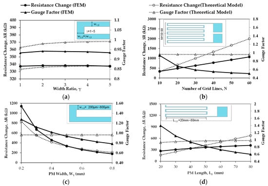 Figure 2 shows the variation in the resistance change and GF as a function of the (a) width ratio; (b) number of grid lines; (c) PM width; (d) PM length for the liquid-filled sensor under 30% axis strain in the finite element model and theoretical model. In the following diagrams, the resistance change and GF obtained by FEM are denoted as FEMRC and FEMGF, respectively. Similarly, the theoretical model’s resistance change and GF obtained are denoted as TMRC and TMGF, respectively.